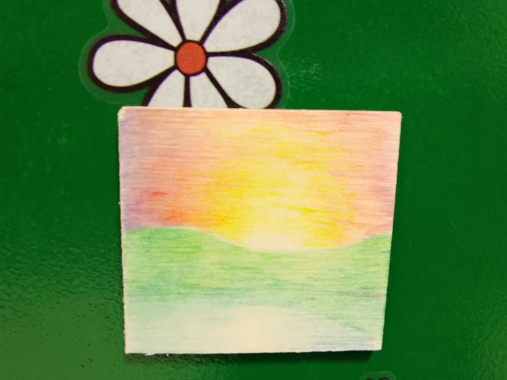 Tavoletta di legno, magnete, pastelli.